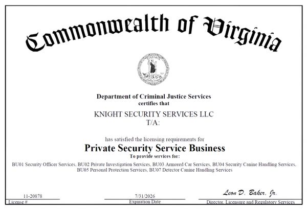 Knight Security Services is a private security and investigations company in Richmond, Virginia licensed though Virginia Department of Criminal Justice Services (DCJS). Over 35 years of experience combined in Security, Law Enforcement, and Military as a team we take pride in our representation as a Security provider to our clients.